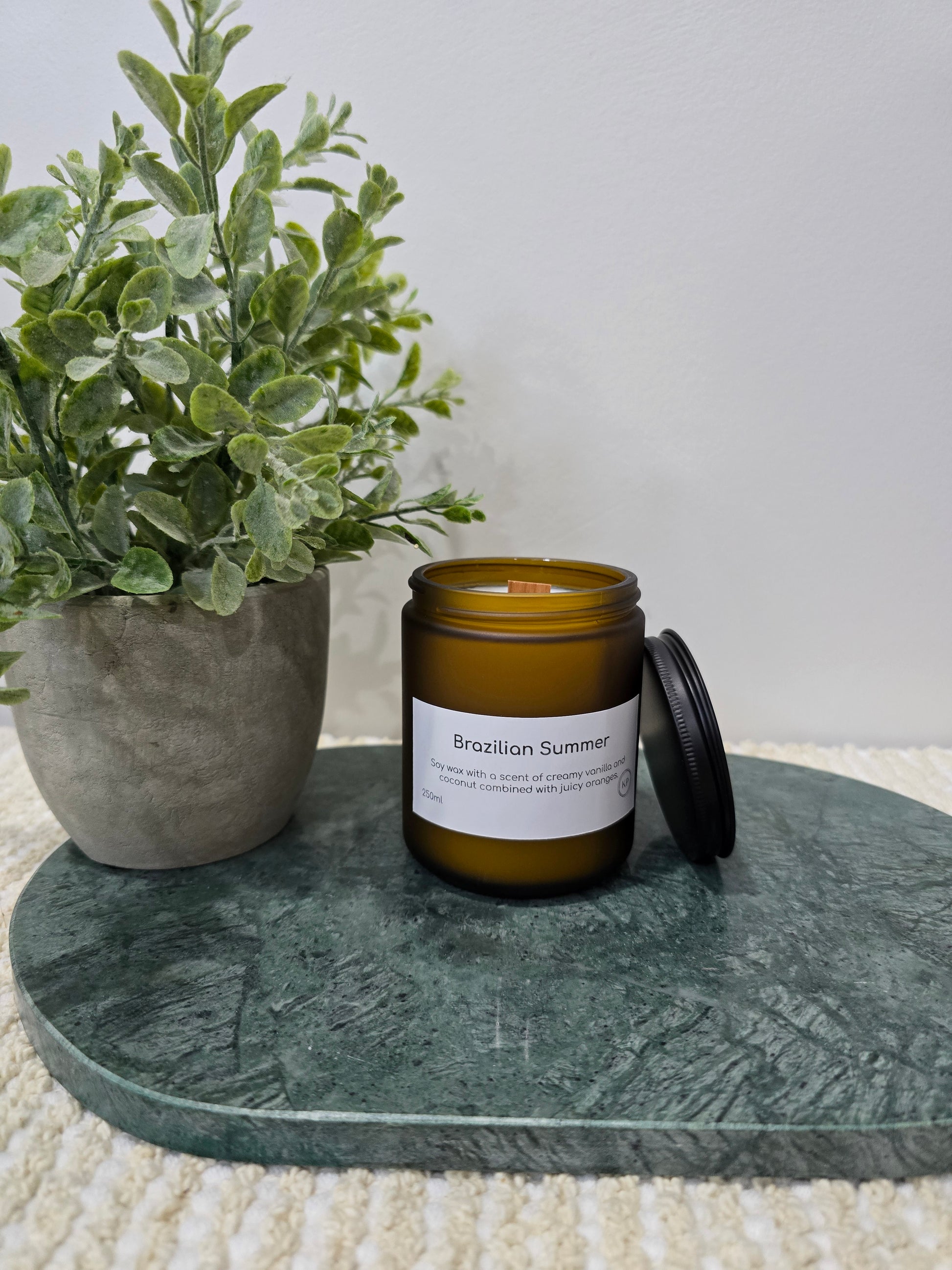 Soy wax with a scent of creamy vanilla and coconut combined with juicy oranges