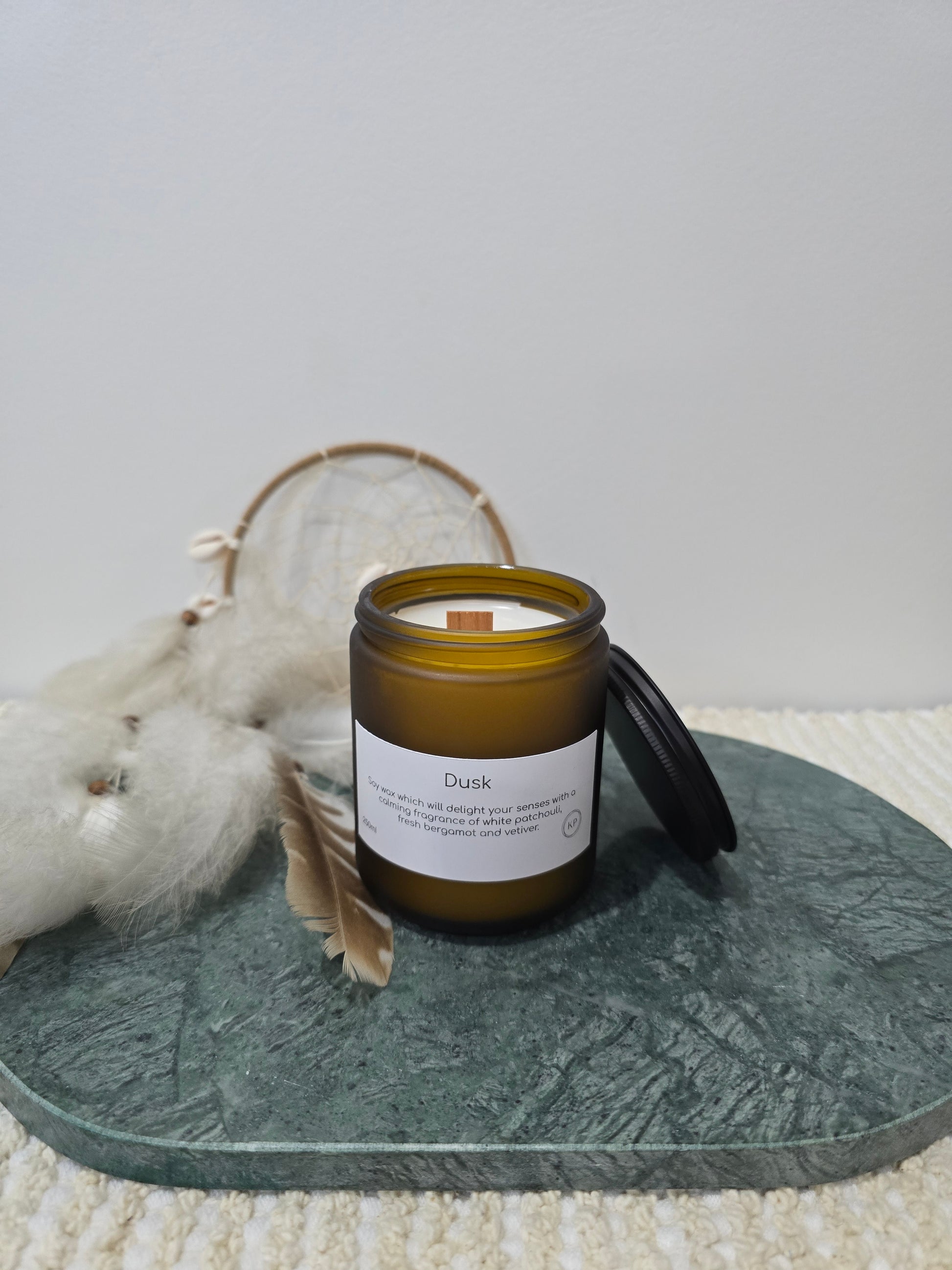 Soy wax which will delight your senses with a calming fragrance of white patchouli, fresh bergamot and vetiver