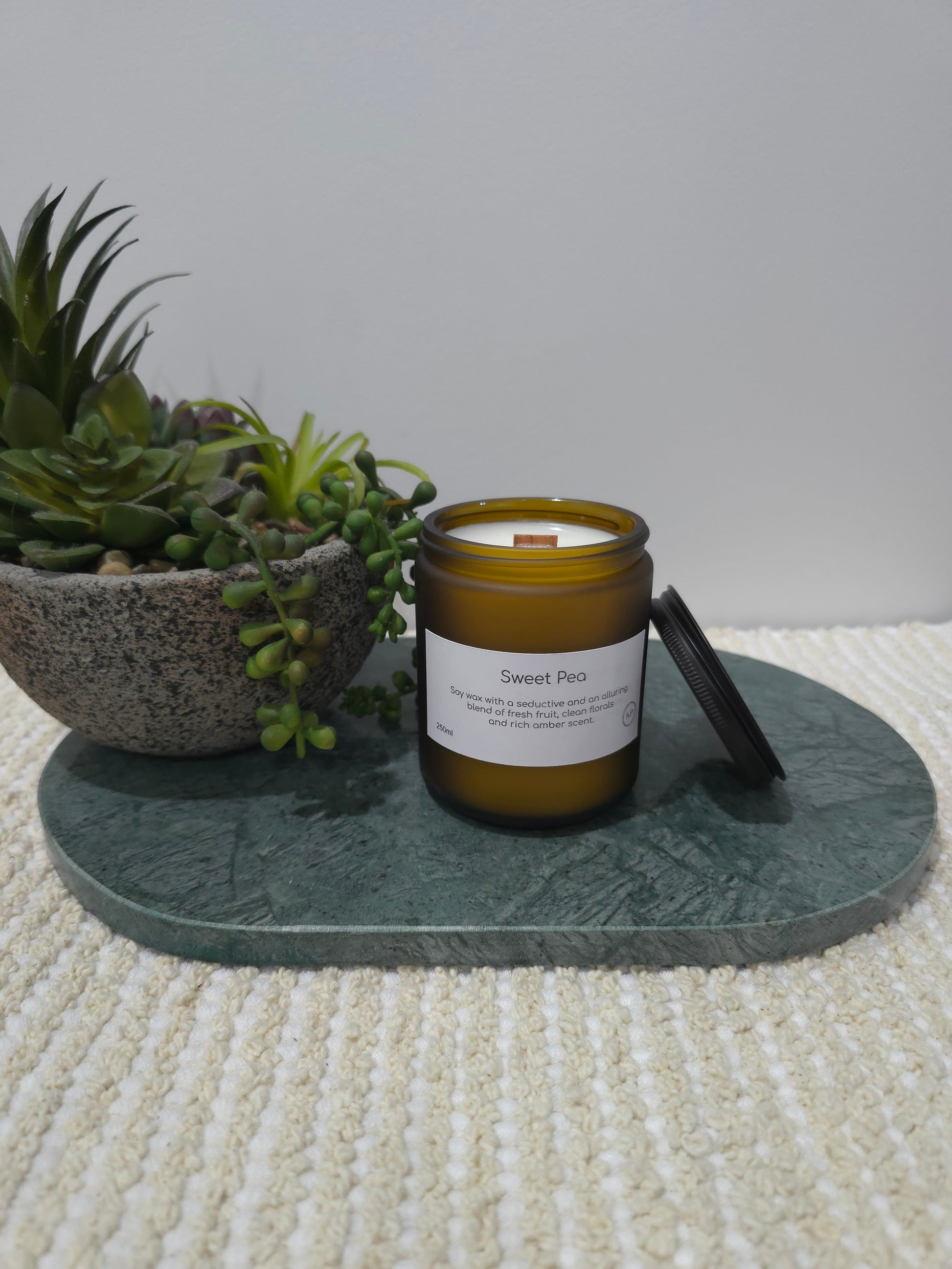 Soy wax with a hypnotic fusion of white jasmine and sweet pea with a twist of sandalwood and musk