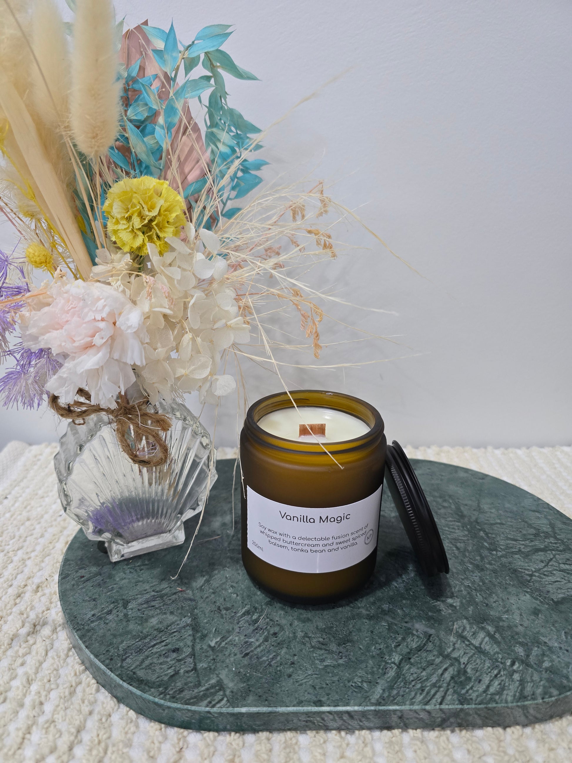 Soy wax with a delectable fusion scent of whipped buttercream and sweet spiced balsam, tonka bean and vanilla